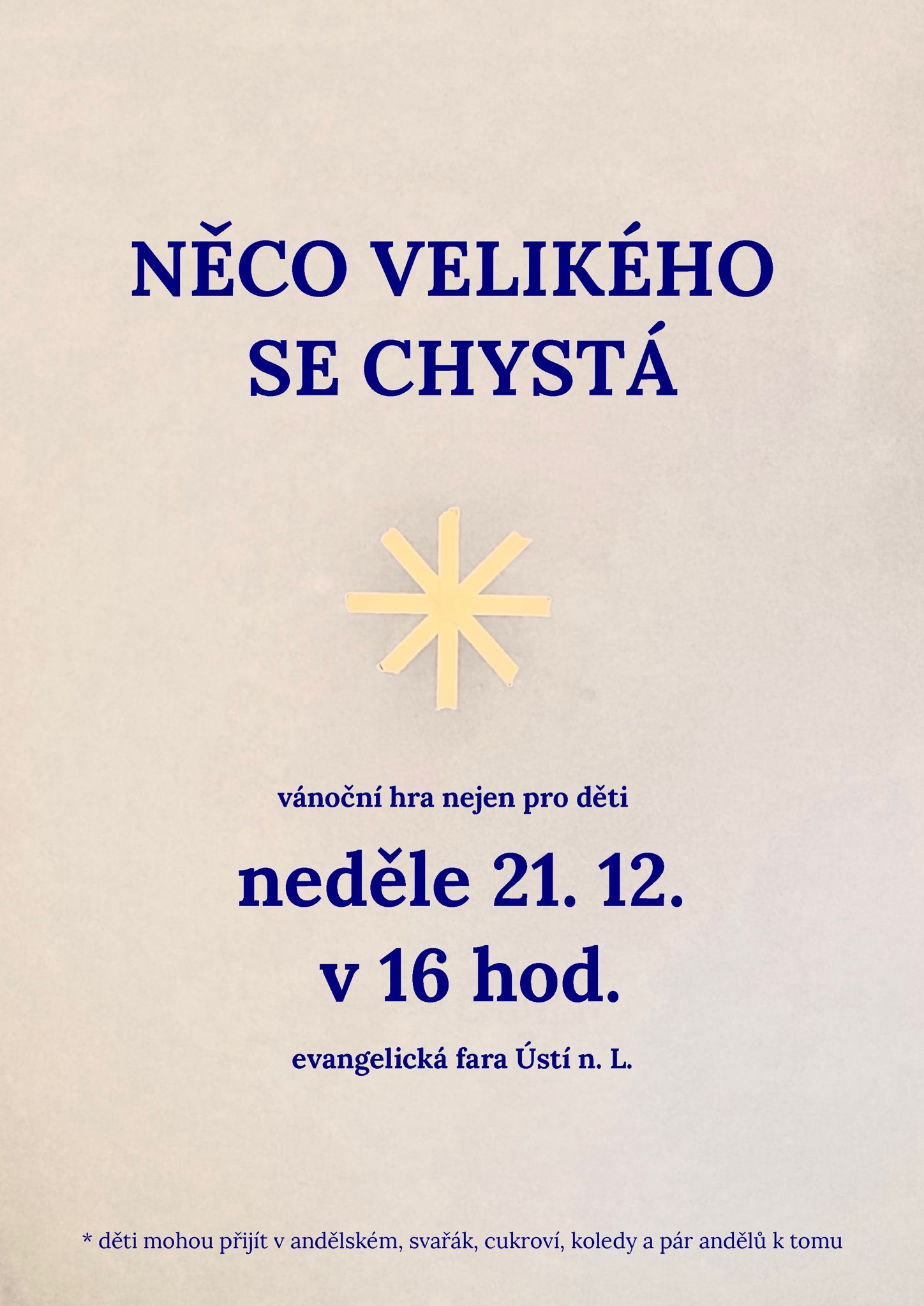 | 21. 12. | 4. adventní neděle Bohoslužby s divadlem „NĚCO VELIKÉHO SE CHYSTÁ“+ vánoční sousedský a sborový svařák | 16:00 | na faře | |